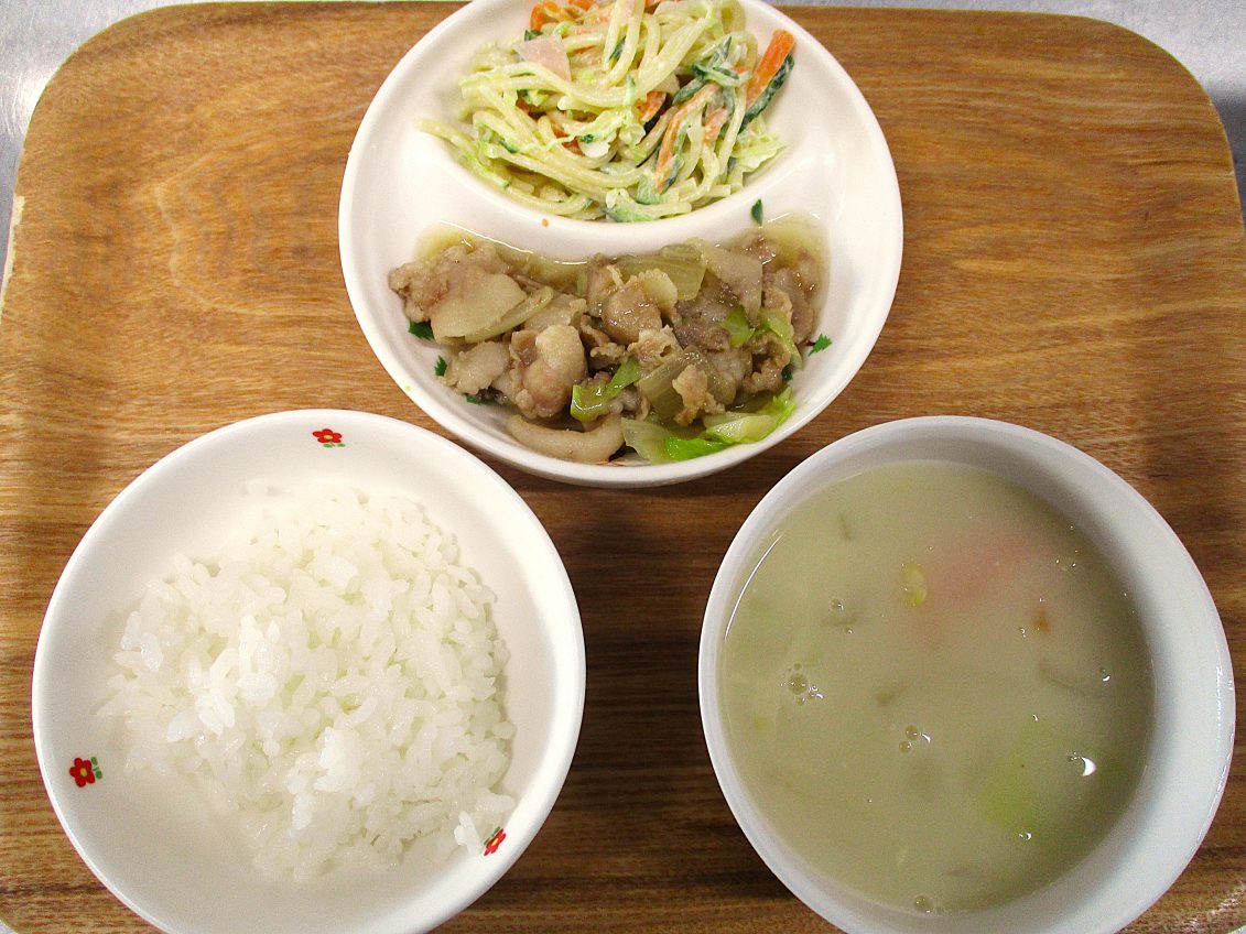 麦ごはん・豚肉のしょうが焼き・あさりとキャベツの豆乳汁・パスタサラダ の4品でした🌈