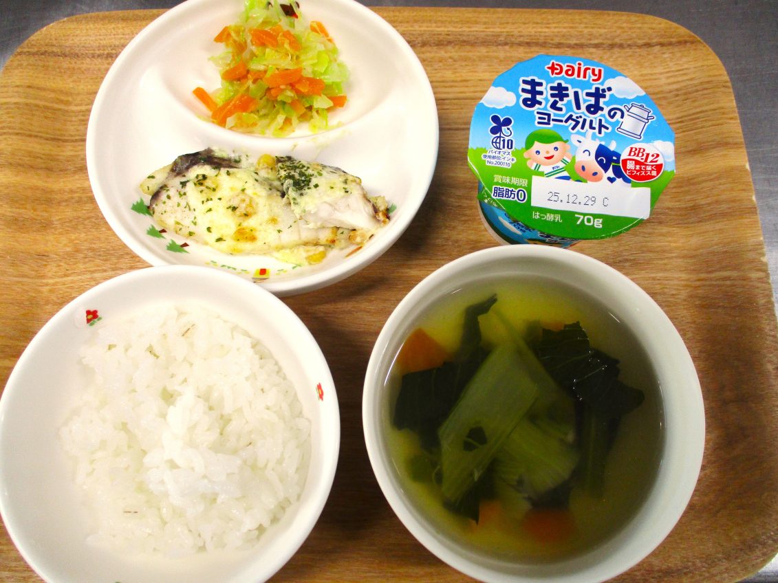 麦ごはん・白身魚のコーンマヨ焼き・トマトスープ・コールスローサラダ・ヨーグルト の5品です✨