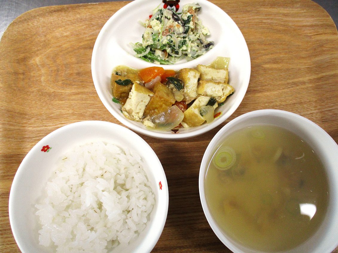 主菜の厚揚げの炒め物は、厚揚げをたっぷり使って食べごたえ満点😋🥢外は香ばしく、中はふんわりで、野菜と一緒に炒めることで旨みがぎゅっと詰まった一皿になりました。食べ始めると「これおいしい!」と声があがり、おかわりをする子もたくさんいました🌟