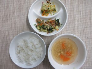 今日の給食は、揚げ鶏の五目和えでした。鶏肉・大豆・ほうれんそう・にんじん・さつまいもの5種類の食材が入っていて具沢山でした。食感や味もそれぞれで違い、味わうことができました。食材それぞれに味が染みて、おいしかったです。アスパラサラダは、さっぱりとしていて食べやすく、パクパク食べていましたよ。切干大根のスープも程よい味付けで、とてもおいしかったです。