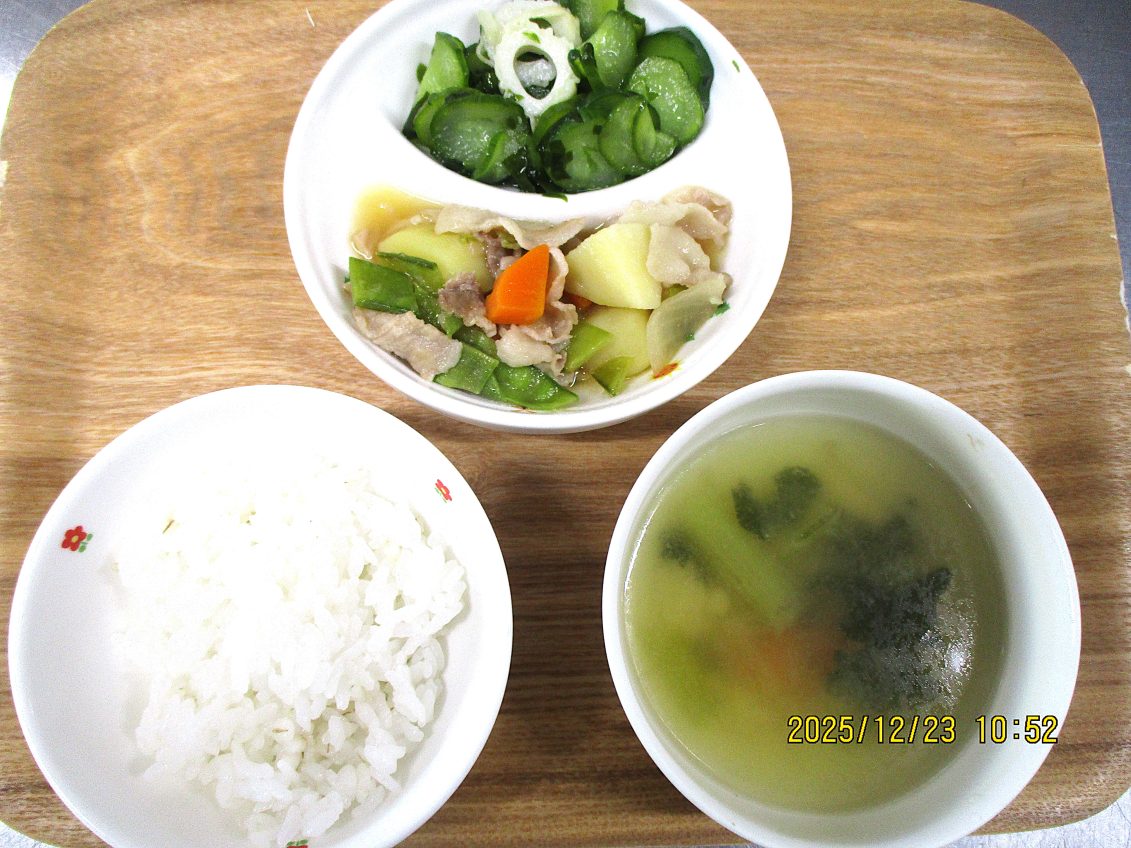 ・麦ごはん ・肉じゃが ・きゅうりとちくわの酢の物 ・味噌汁」(小松菜)