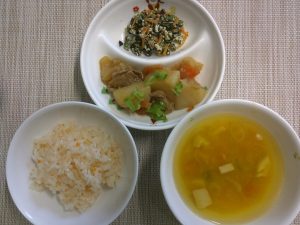 今日の給食は、肉じゃがでした。味のしみ込んだ具材とホクホクじゃがいもがとってもおいしかったです。ごはんはもみじごはん。人参の鮮やかな色がきれいでした。