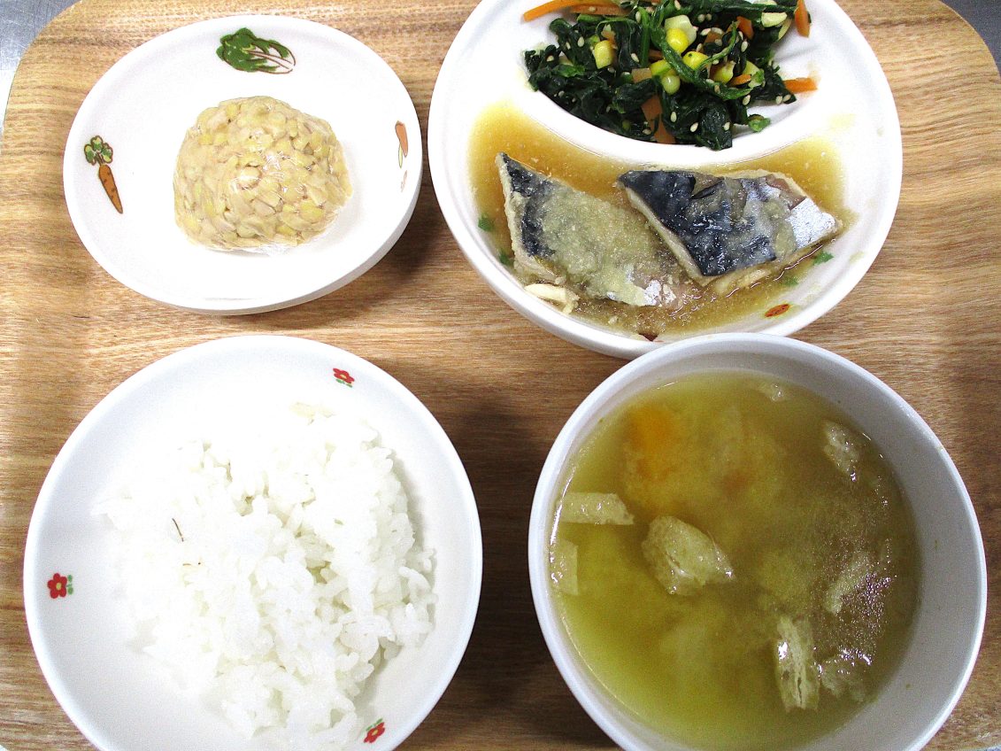 ・納豆ごはん ・サバのおろし煮 ・五目みそ汁 ・ほうれん草のナルム