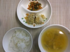 今日の給食は生パン粉と粉チーズとパセリをまとった鶏肉のパン粉焼きでした。生パン粉の味と粉チーズの塩気がきいていて、鶏肉も肉厚で柔らかく子供達も美味しそうに食べていました。大豆汁は大豆、かぼちゃの甘味と煮だしたかつおのお出汁がきいていてとってもおいしかったです。小松菜の煮びたしも人参と小松菜、油揚げをお出汁で美味しく食ベることができました。今日も全部完食、おかわりもたくさんしてくれました。