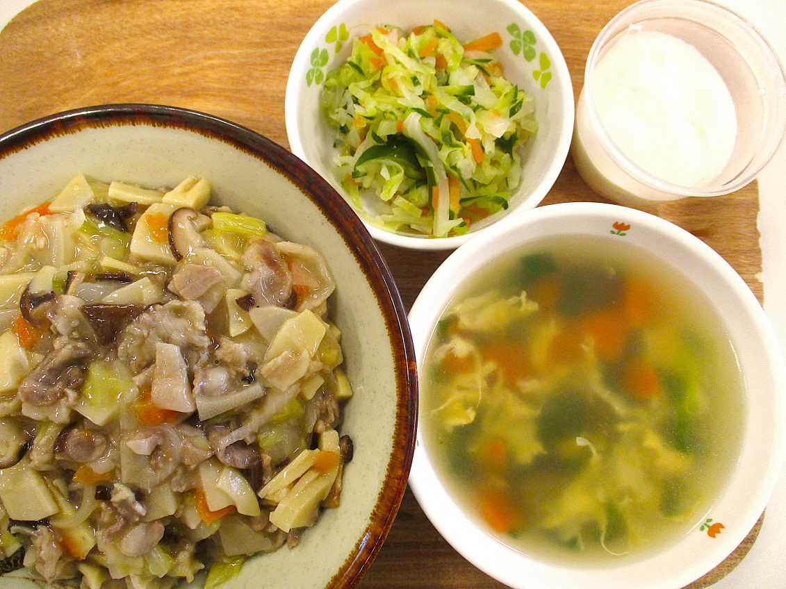 副菜には、たまごスープとキャベツときゅうりの酢和えを添え、さっぱりとした味わいでバランスの良い献立に🥬