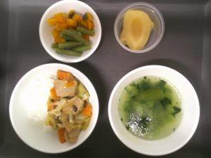 今日の給食は、お野菜たっぷり中華丼でした。丼ぶりが大好きなこどもたち♬今日もたくさんおかわりしてくれました。お汁も中華味で丼ぶりとの相性がぴったりでした。ゆで野菜はいんげんとかぼちゃでした。やわらかいかぼちゃといんげん、お野菜そのものの素材の味が美味しく、すすんで食べていました。デザートは人気のもも缶でした。デザートまで全部完食していました。