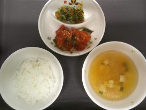 今日の給食は、さばのプロバンス風でした。にんにくが効いたトマトソースがさばの上にかかっていてご飯が進みました。こども達はたくさんおかわりしていましたよ。野菜のおかか和えは、おかかが入っていることで食べやすく、野菜もおいしく食べることができました。豆腐のすまし汁はかつおだしがきいていて飲みやすかったです。今日もこども達はいっぱい食べて、ピカピカになったお皿を見せてくれましたよ✨