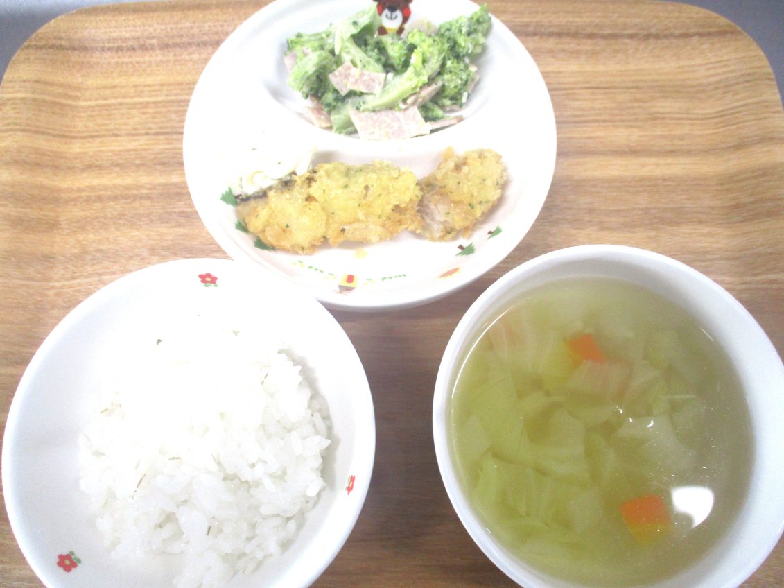 ・麦ごはん ・白身魚フライ(タルタルソース) ・野菜スープ ・ミモザサラダ