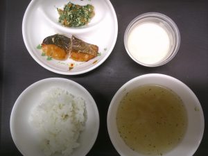 今日の給食は、さけの照りつけでした。醤油ベースの味付けでごはんが進み、こども達もよく食べてくれました。さけから食べている子も多く、おかわりをしている子もいましたよ✨白和えは見た目から苦手としている子もいましたが、一口食べてみるとおいしく、お皿にのっているものを最後まで食べきることができました✨オニオンスープは、たまねぎの甘味が感じられ、飲みやすかく、きな粉ヨーグルトは、ほんのりきな粉の味がして、おいしかったです。今日もいっぱい食べてくれましたよ☺