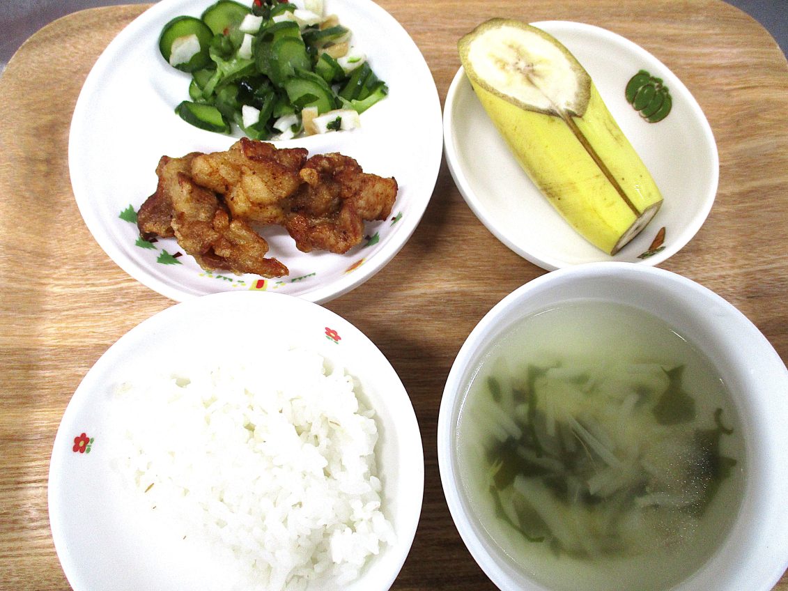 ・麦ごはん ・鶏の唐揚げ ・きゅうりの酢の物 ・中華スープ ・バナナ
