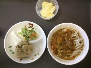 今日の給食は、カレーうどんでした。昆布とかつおだしだけでなく、豚肉と油揚げのお出汁も出て、おいしかったです。こども達も久しぶりのうどんで嬉しそうでした☺ブロッコリーのマヨネーズ和えは、マヨネーズ味だったので食べやすく、こども達もよく食べていましたよ。昆布おにぎりもあり、今日もお腹いっぱい食べることができました。大好きなパイン缶は、1個ずつ味わって食べていましたよ。