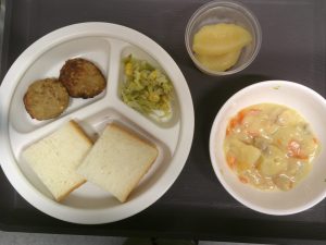 今日の給食は、お誕生日会メニューでした。今日のメニューは子どもたちが好きなものが多く、よく食べていました☺クリームシチューは、ルウを使わずに、米粉を使った手作りでした。お肉も柔らかく、とってもおいしかったです。豆腐ハンバーグは、豆腐が入っていてやわらかく、これもおいしくて大人気でした。アスパラとコーンのサラダはさっぱりとしていて、食べやすかったです。今日は主食が食パンということもあり、シチューにつけて食べたり、ハンバーガーのように挟んで食べたりとそれぞれでアレンジをして楽しんでいましたよ♬
