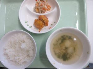 今日の給食は、納豆のおとし揚げでした。食育活動で大豆製品のことを知ったからか、納豆は進みがよく、一番目に食べている子が多かったです。食育活動を振り返り、「納豆も大豆だから栄養がいっぱいあるよね」と伝えてくれたたいよう組さんもいましたよ。もやしのごま酢和えは、酸味が程よく、ささみも入っていておいしかったです。じゃがいものスープはじゃがいもに中華だしの味が染みて、おいしかったです。今日もいっぱい食べてくれました✨