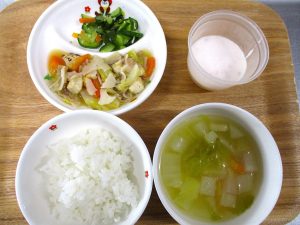 ・麦ごはん ・豚肉とキャベツのすき焼き風煮物 ・五目味噌汁 ・きゅうりの酢の物 ・ヨーグルト(イチゴジャム)