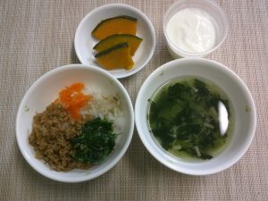 今日の給食はキッズビビンバでした。ひき肉やお野菜たちが彩りよく並べられており、食欲がそそられたのか、おいしい!といいながら沢山食べてくれていました✨中華スープはお野菜も食べやすい大きさにカットされており、こぼさないように上手にお口に運んでいましたよ☺蒸しかぼちゃもかぼちゃ本来の甘味を感じられおいしかったです!マーマレードヨーグルトは、果肉の甘さがヨーグルトと相性抜群でみんなきれいに食べてくれていました♪