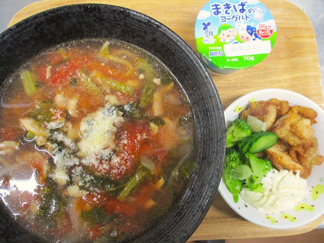 鶏ガラだしをベースに、醤油でやさしく味を整え、ホールトマトをたっぷり使用することで、ほどよい酸味とコクのあるスープに仕上げました。具材には野菜もたくさん入り、見た目にも彩り豊かで、食欲をそそる一杯となりました😊