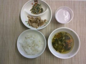 今日の給食は、豚肉の香味炒めでした。にんにくがきいていて、子どもたちもおいしい~!と言いながら食べていましたよ。白和えはひじきも入っていて、栄養たっぷりの白和えでした。醤油ベースの味付けで、とってもおいしかったです。小松菜のすまし汁は、お出汁がきいて飲みやすかったです。デザートにはブルーベリーヨーグルトでした。ほし組さんはお口の周りにヨーグルトをつけて、嬉しそうに食べていましたよ☺