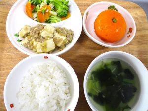 ・麦ごはん ・マーボー豆腐 ・中華スープ ・ブロッコリーとチクワのサラダ ・みかん