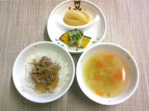 今日の給食は、丼ぶりメニューでした。豚丼は、味がしっかりついていてご飯が進みました。子どもたちもおいしい~!と言いながら、たくさん食べてくれましたよ☺キャベツのスープは、お野菜たっぷりでやさしい味でした。キャベツが甘く、おいしかったです。かぼちゃのマリネも甘いかぼちゃとお酢や砂糖で和えたきゅうりとたまねぎが合わさりおいしかったです。子どもたちは、おかわりもしていましたよ♬デザートは、もも缶!喜んで食べていましたよ。
