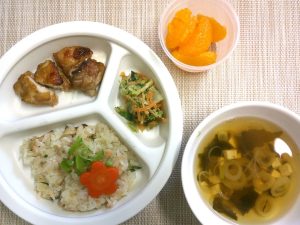 今日の給食は、ひな祭りということで、お祝いメニューでした。ひな祭り寿司は、梅型のにんじんやきぬさやで彩りよく、見た目でも楽しむことができました✨鶏肉の照り焼きは、お肉に味がしみ込みとってもおいしかったです。なばなのツナごま和えも、ごまたっぷりでお野菜をおいしく頂くことができました。豆腐のすまし汁も、おだしがきいて飲みやすく、子どもたちもよく食べていましたよ。
