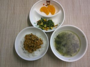 今日の給食は、ビーンズライスでした。お肉やお野菜以外に大豆や干しぶどうも入っており、具沢山で子どもたちもいっぱい食べてくれていました✨はるさめスープは、はるさめのツルツルした食感を気に入ってくれたようで、上手にすくって食べてくれていましたよ♬小松菜のごま和えも黄色や緑など彩りも良く、おかわりもしてくれていました☺みんな大好きみかん缶までぺろりと完食してくれました✨