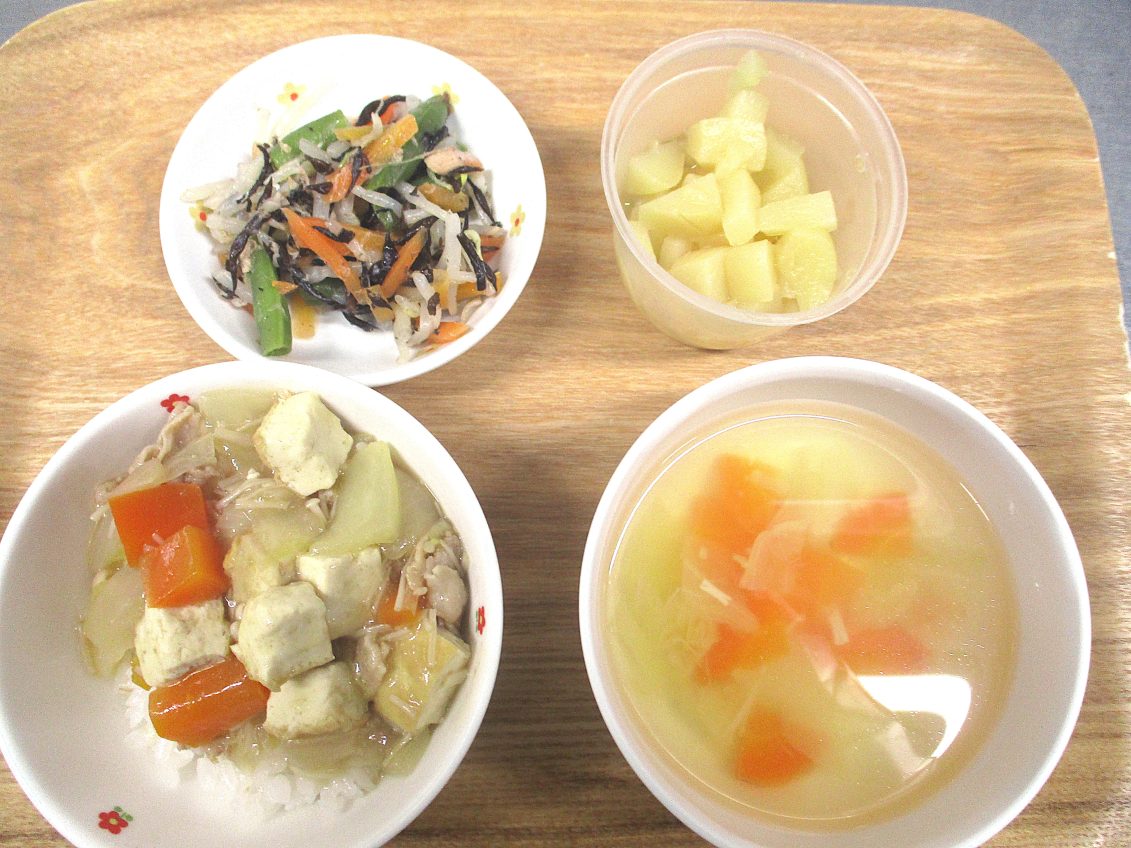 今日の給食の中華丼には、厚揚げ・豚肉・玉ねぎ・人参・えのきなど