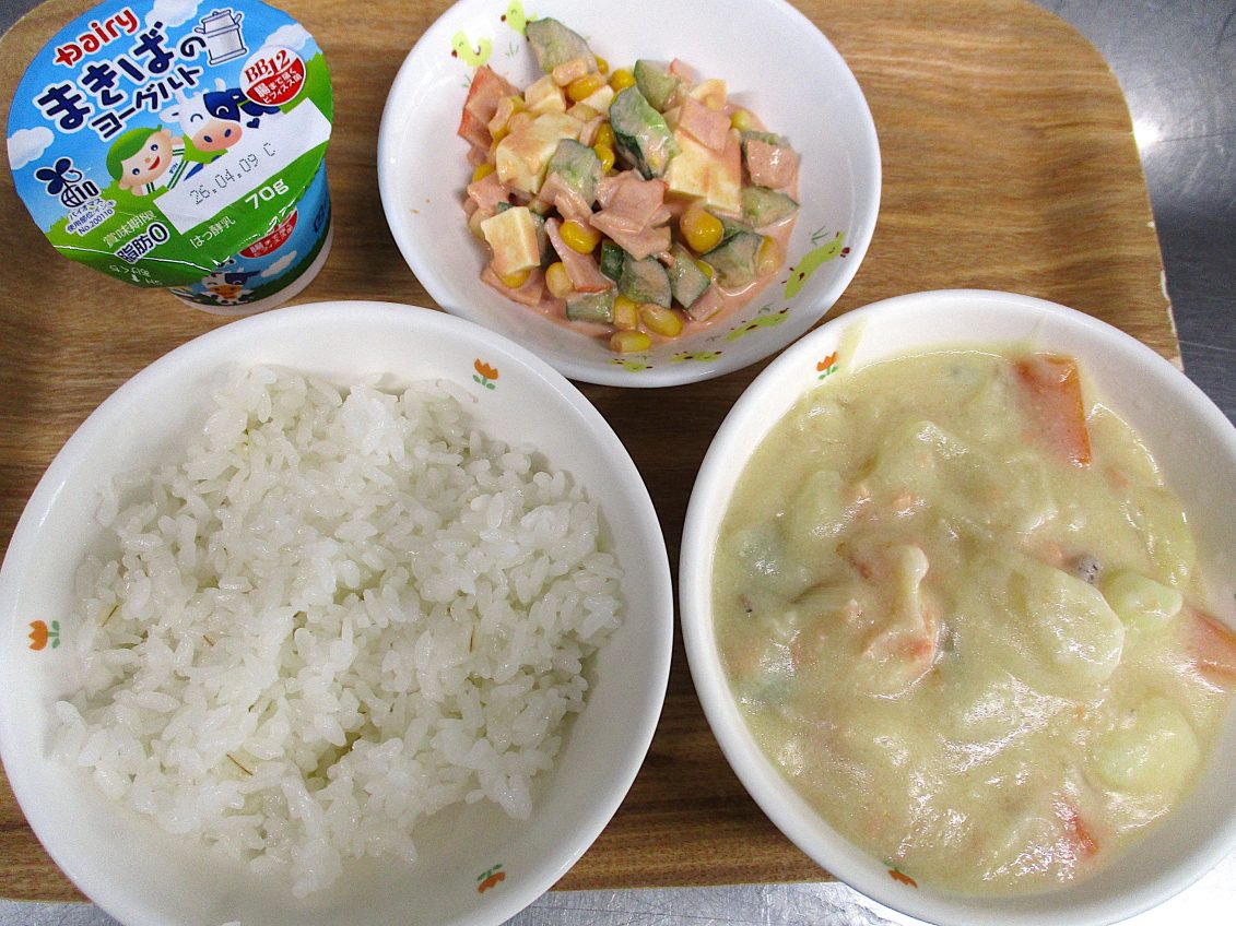 日の給食は、麦ごはん、サーモン豆乳シチュー、コブサラダ、まきばのヨーグルトでした🍚🐟🥗